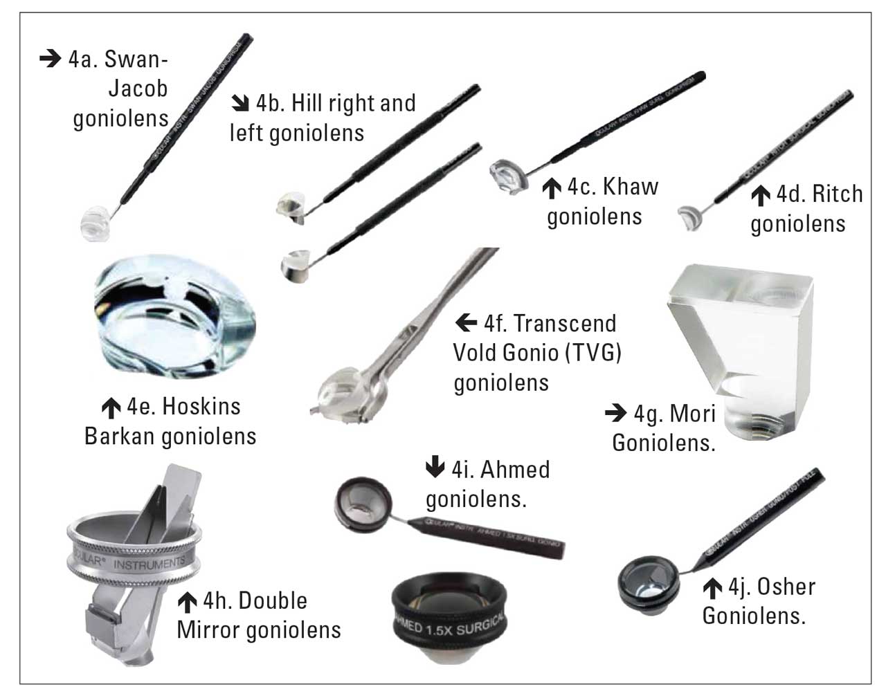 Direct gonioscopy lenses, such as the Koeppe lens and Swan-Jacob lens (Figure 4a), are commonly used in the operating room when the patient is supine. They allow for direct visualization of the angle, producing an erect, noninverted image of the target angle. The Koeppe lens is very commonly used for evaluation of children, often with the use of a portable slit lamp in the other hand.3 The Swan-Jacob gonioscopy lens typically has an attached rod to allow for manipulation during intraoperative procedures and require use of a coupling agent.3