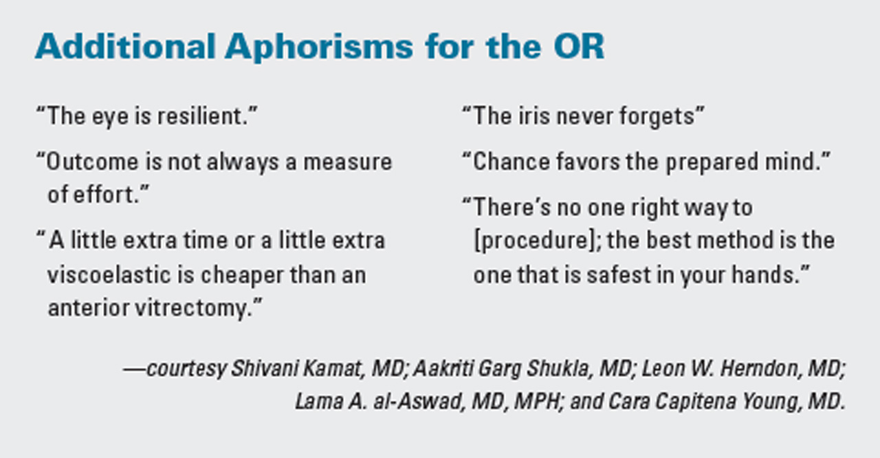Aphorisms endure partly because they are powerful teaching tools. As a surgical intern, I never needed explicit instruction to avoid the pancreas—I had already heard the warnings. If we can impart similarly memorable guidance to our trainees, we may spare them and their patients unnecessary hardship. One experienced glaucoma surgeon recalled his fellowship mentor’s advice: “The most important step of this surgery is preparing in your mind what the next surgery may need to be.” Another pair of aphorisms illustrates the conflicting directives that often accompany surgical training: “Don’t just stand there—do something!” contrasted with “Don’t just do something—stand there.” (As a former resident instructor, I usually go with the latter.)