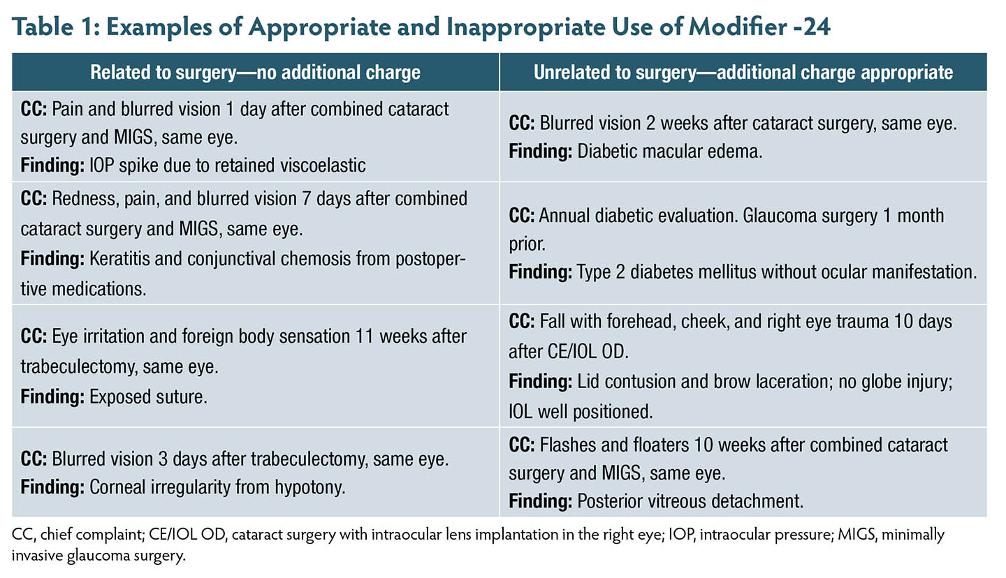 For billing purposes, “unrelated” refers to a problem or condition that is not connected to the surgery in any way. It is not a surgical complication or adverse event, nor is it typical follow-up care to monitor recovery. Modifier -24 may be applied to preexisting conditions independent of the surgery or to conditions in the unoperated eye. Several publications provide additional guidance on this topic.4-6 Table 1 provides some examples that can illustrate this concept.