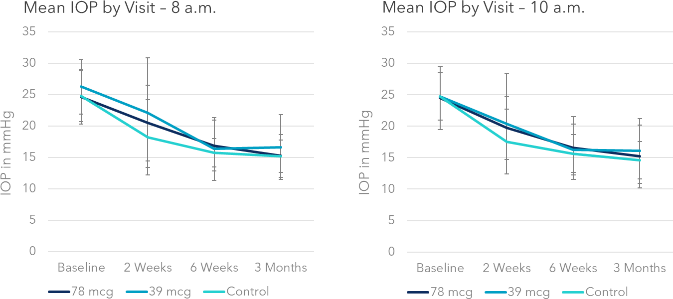 According to SpyGlass Pharma, at 3 months patients achieved a 37% and 36% reduction in mean IOP from baseline in the 78-μg and 39-μg dose groups, respectively, compared to a 37% reduction in the control group at 8 AM. Results were similar at the 10 AM time point (Figure 1). In addition, 98% of patients (49 of 50) in the 78-μg dose group and 96% of patients (22 of 23) in the 39-μg dose group were free from all topical IOP-lowering medications. Patients demonstrated vision improvement, reaching 20/40 or better BCDVA and mean BCDVA of 85 to 86 letters (~20/20 vision).